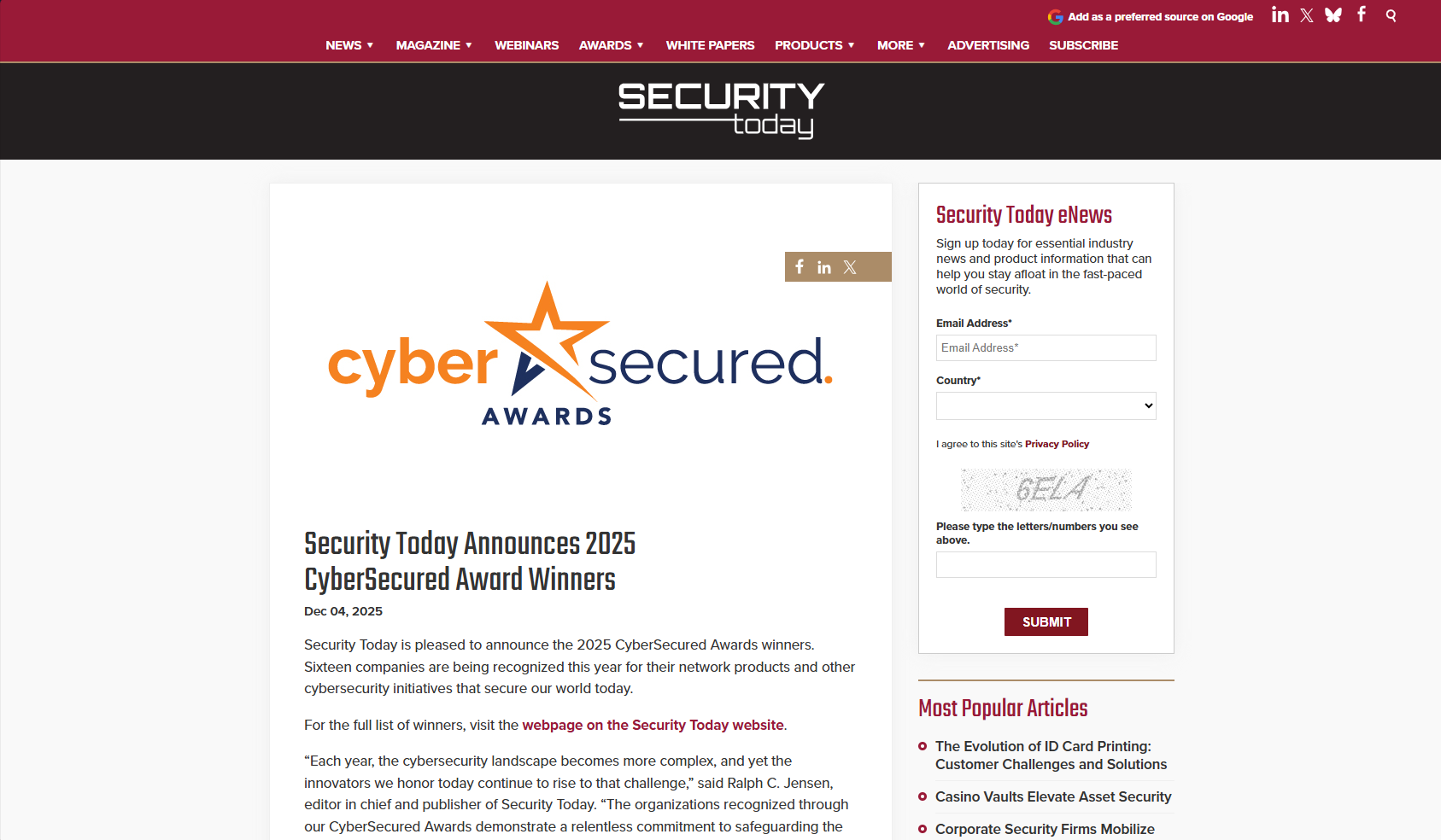 Security Today Announces Winners of its 2025 CyberSecured AwardsNews and Events